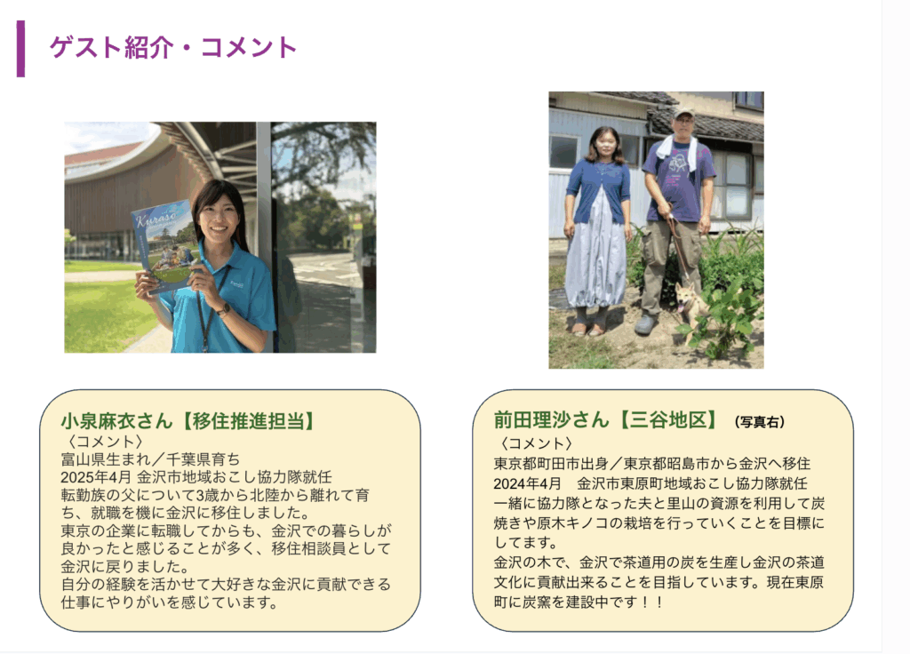 「大学を卒業したらどの地域で働こう?」「移住に興味があるかも!」「地域おこし協力隊って実際どんなことをしているのだろう?」そんな風に思っているあなたにおすすめのイベントです!このイベントでは、金沢市の地域おこし協力隊の方2人をお招きして、地方移住のリアルな実態や地域おこし協力隊の経験談を聞きながら、自分に合った働き方や生計の立て方などを考えます。少人数で対話形式のイベントなので、気になったことがあれば、気軽に聞いたり話したりすることができます。地域での暮らしや働き方を一緒に考えましょう。