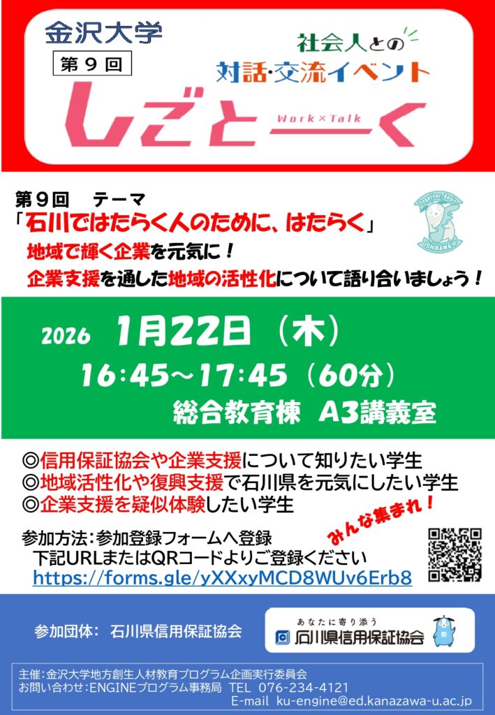 金沢大学ENGINEプログラム事務局より、第9回「金沢大学しごとーく」開催のお知らせです。